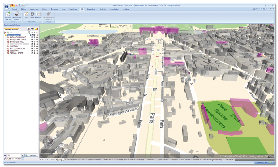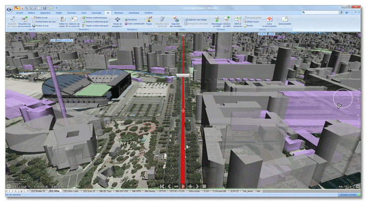 3D for Geoconcept confers the ability to create 3D routes from a line or succession of points and to travel this route in a number of different modes, pedestrian, car, pursuit, helicopter or plane. A route reading interface rounds off these sophisticated navigation features.