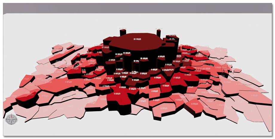 Thematic 3D representations are opening up new analytical opportunities. Color gradations and symbols make it possible to highlight the spatial variation of phenomena. Among the available representations: textures, extruded objects, tubes, cylinders…