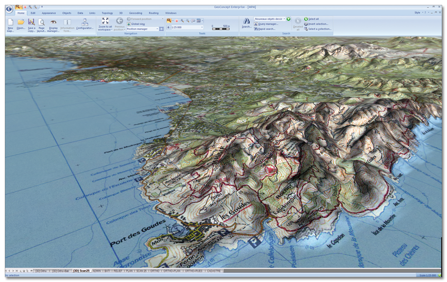 3D for Geoconcept imports numerous digital terrain model formats (DTM, ASC, XYZ, GRD, DIS, TIFF, GEOTIFF...) and 3D models in the 3DS, DAE (Collada), OBJ, FLT, VRML, V3B...format DTM reprojection is also handled. In output mode, export to SketchUp Google in SKP format is accomplished in one click.
